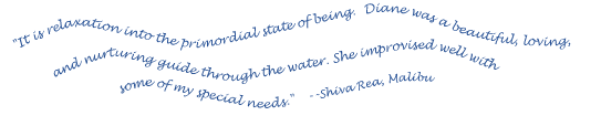 Diane offers Watsu®, WaterDance and WRT Water Release Therapy® Sessions in two locations in Santa Barbara: Healing Waters and the Cottage Care Health Systems. Diane offers WRT Water Release Therapy® Private Sessions, 2-3 Day WRT Intensives, and Group WRT Water Release Therapy® 'Provider" Trainings in beautiful waters Worldwide.